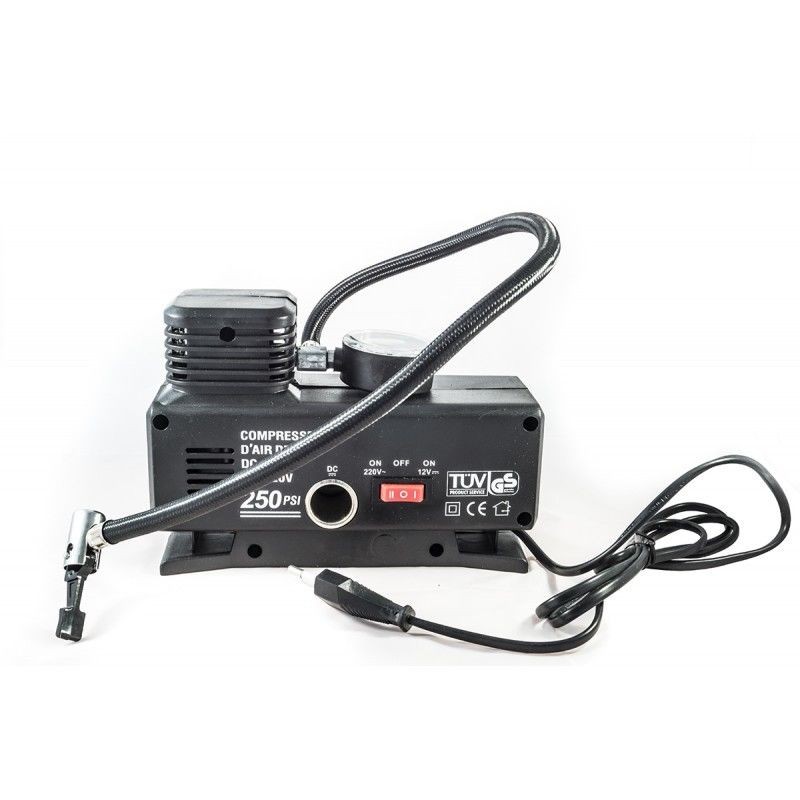 COMPRESSORE COMPATTO - POTENZA 250 PSI - POSSIBILITA' DI ALIMENTAZIONE SIA DA ACCENDISIGARI SIA DA PRESA DOMESTICA - 3 UGELLI IN DOTAZIONE - MANOMETRO