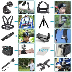 - Contenuto principale della confezione 50in1: - 1 * ventosa - 1 * maniglia galleggiante - 1 * cintura - 1 * cinghia per guinzaglio assicurativa - Clip da cintura girevole 1 * 360 gradi - 1 * cinturino da polso - 1 * monopiede a mano - 1 * manubrio della bicicletta - 1 * fascia toracica - 1 * gruppo fascia - 1 * chiave di fissaggio - 1 * adattatore per treppiede - 1 * borsa portatile - 1 * braccio di estensione del casco - 1 * cintura di installazione del casco - 1 * mini treppiede - Supporto interruttore 2 * - 2 * ganci a J. - 3 * montaggio di base - 3 * staffa piatta - Gruppo curva 2 * - 4 * viti - 5 * cuscinetti adesivi - 12 * cuscinetti anti-appannamento