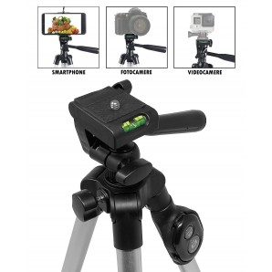 Il supporto Camera Tripod, include un supporto per smartphone, quindi oltre a montare la tua fotocamera, puoi collegare qualsiasi smartphone fino a 9cm di larghezza.