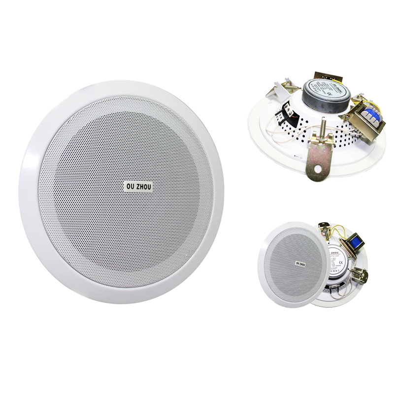 Cassa audio ideata per fissaggio a soffitto con incasso a molle. Tweeter biconico nella sua forma particolarmente piatta con griglia metallica fissa. Diffusori acustici da incasso con trasformatore adatti alla sonorizzazione di qualsiasi ambiente, il loro sistema di fissaggio a molle rende l'installazione semplice e veloce.