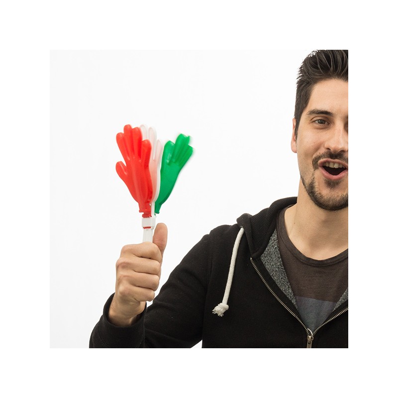 Non andare allo stadio senza i battimani con Bandiera Italiana per tifare la squadra italiana nelle prossime competizioni sportive! Realizzati in plastica. Dimensioni: 13 x 27 x 2 cm circa. Espositore punto vendita in omaggio con l'acquisto di 24 unità.