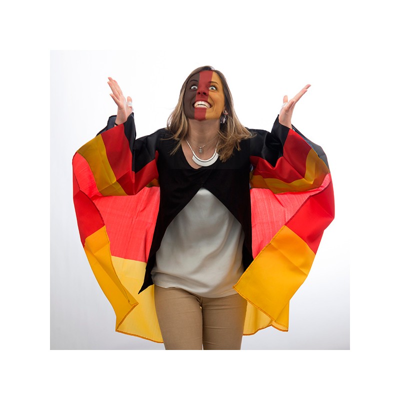 I tifosi vicini a te potranno capire a colpo d'occhio qual è la tua squadra del cuore grazie a questa mantella bandiera Tedesca! Ideale per sfoggiare tutto l'amore per la tua nazione! Dispone di maniche. 100 % poliestere. Dimensioni: 150 x 90 cm circa.
