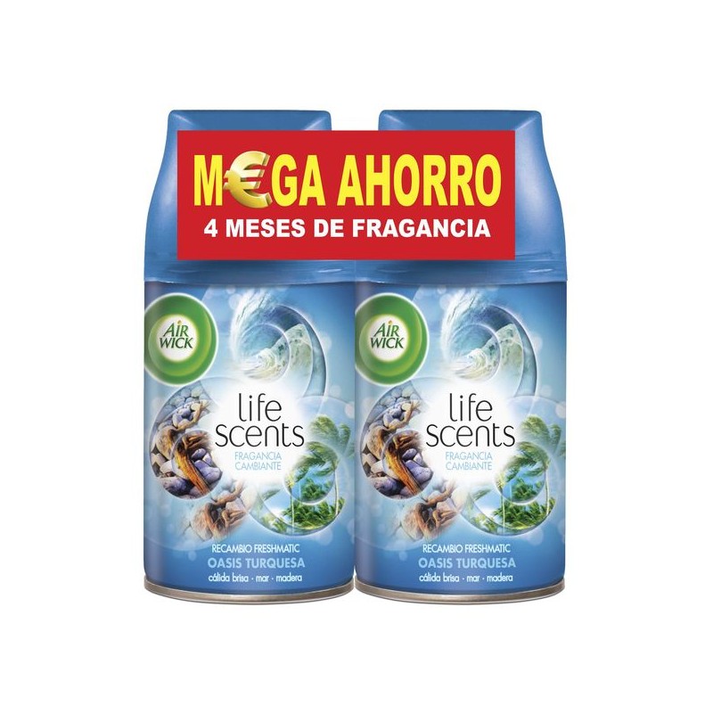 Stai cercando una fragranza che rievochi la bellezza selvaggia di un'oasi paradisiaca e i suoi profumi di legno alla deriva bagnato dal sole, la schiuma salata del mare e la brezza calda? La ricarica per deodorante per ambienti Air Wick FreshMatic Duplo Life Scents Oasis turchese 2 x 250 ml ti consente di mantenere la tua casa profumata per quattro mesi con la migliore fragranza.