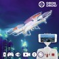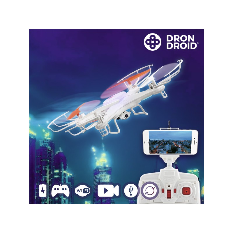 Se vuoi migliorare le tue abilità e quella dei tuoi familiari e amici, divertiti a pieno con il drone droid Hanks WFHDV2000! Questo incredibile drone volante dispone di videocamera, rotazione da 360º, luci LED e telecomando a distanza (funziona a batterie: 6 x AA, non incluse). Include: cavo di ricarica USB, 4 eliche di ricambio, 4 coperture protettive, 2 pattini d'atterraggio, supporto per smartphone e cacciavite. Grazie alla sua videocamera, il volo può essere riprodotto in tempo reale su uno smartphone, (connessione Wi-Fi necessaria). Basta scaricare l'applicazione RC-Skyline da Google Play o App Store e divertirti!
