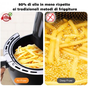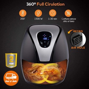 Questa friggitrice ad aria senza olio ha una capacità di 2.4 litri e può essere utilizzata per cucinare arrosto e fritti vari. Essa cucina cibi deliziosi riducendo il grasso dell'80% ed evita l’effetto bruciacchiato; adatta per le feste, le riunioni di famiglia e gli amanti del cibo. Il cestello di cottura si estrae come un cassetto, tirando una maniglia sul fronte dell’apparecchio e poggiandolo su una superficie piana per caricare gli ingredienti