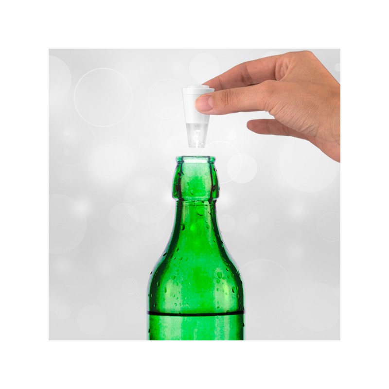 Distinguiti durante le tue feste grazie al tappo da vino con LED! I tuoi invitati perderanno la testa quando si accorgeranno che il tappo illumina delicatamente la bottiglia che metti sul tavolo. Dispone di luce LED e tasto d'accensione. Funziona a batterie (3 x LR41, incluse). Compatibile con bottiglie di un diametro massimo di: 2 cm circa. Dimensioni: 2,2 x 4,5 x 2,2 cm circa.