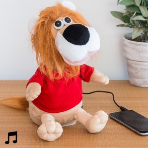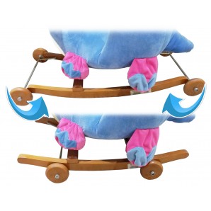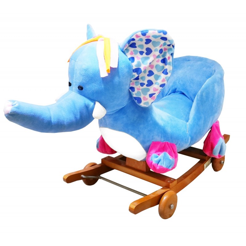 Elefante a dondolo con base di legno e corpo in morbido peluche resistente.