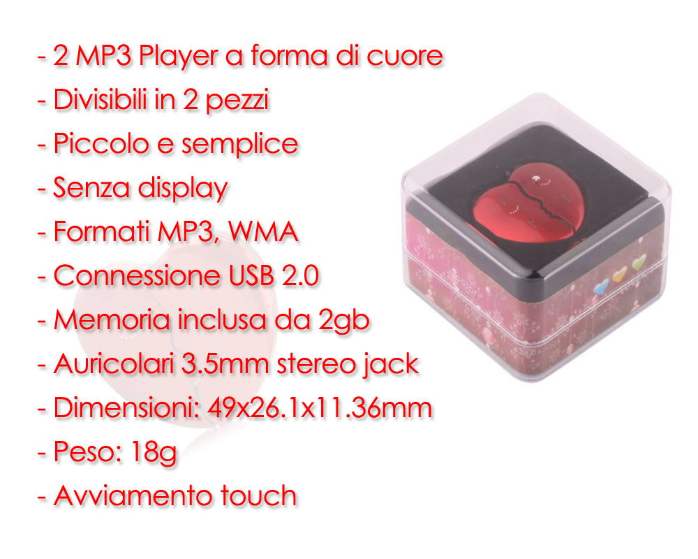 LETTORE MP3 CUORE DIVISIBILE IN 2 PEZZI 2 GB