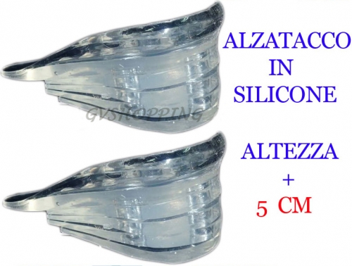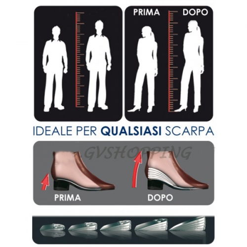 Set alzatacchi in gel da donna siliconato.Inserito nella scarpa permette un'aumento della statura da un minimo di 1cm a 4cm circa tramite i 4 spessori presenti nella confezione,combinabili a piacimento in base all'aumento di statura desiderato ed alla scarpa da indossare.Supporto in gelatina di silicone, con potere ammortizzante.L'alta viscosita' ammortizza i punti di carico sia durante la marcia che in posizione statica. |