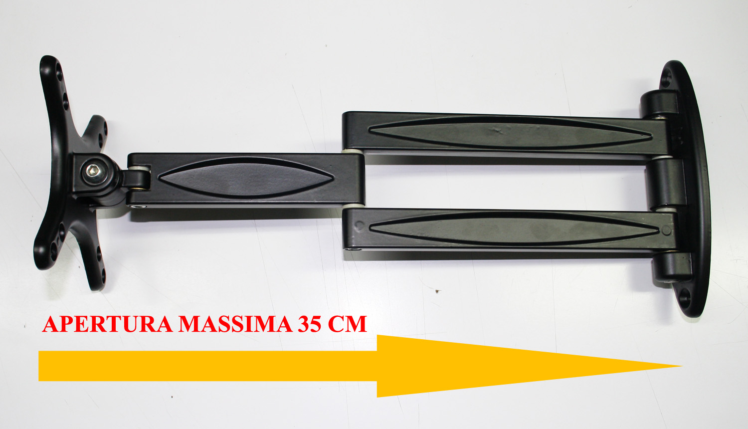 Estremamente sicuro, pratico e versatile, progettato con tre snodi che garantiscono la funzione di rotazione orizzontale di un angolo massimo di 180° e la funzione di inclinazione per la piastra di aggancio al televisore pari a -5/+15°. Il suo braccio in massima estensione raggiunge i 35 cm (circa).