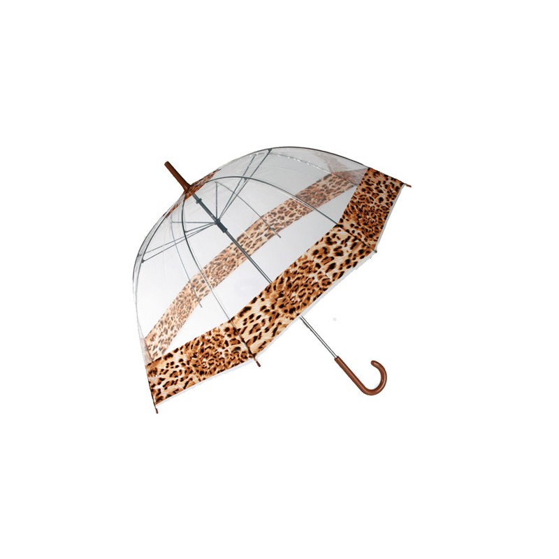 Se ami il motivo leopardato, l'ombrello a cupola Leopard è perfetto per te! Questo elegante ombrello è confortevole ed elegante. La sua cupola o bolla è progettata in modo da coprire grandi aree. La parte superiore e il bordo sono decorate con strisce di colorate secondo il motivo leopardato. La struttura è in metallo e la cupola di plastica. Lunghezza circa: 84 centimetri. Diametro circa: 85 cm.