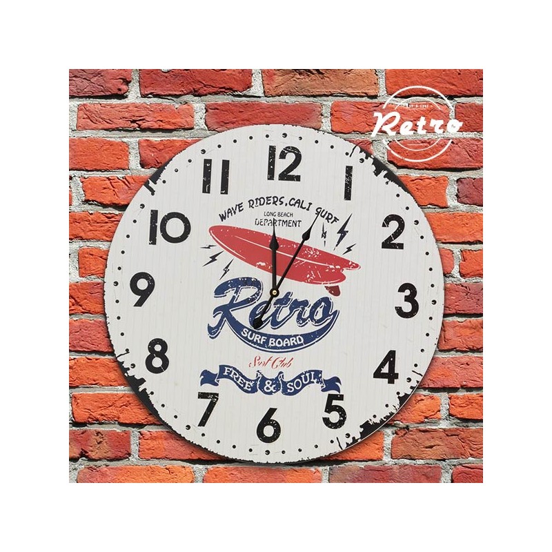 Dai un tocco surfista alla decorazione della tua casa con l'orologio da parete retrò Surf Board! Un orologio analogico di legno. Dimensioni (diametro x spessore): circa 58 x 0,8 cm. Funziona a batterie (1 AA, non inclusa).