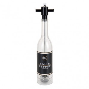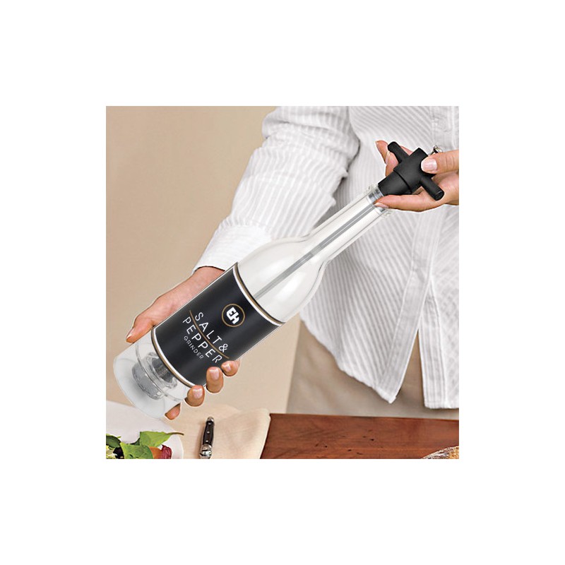 Questo pratico ed elegante macina sale e pepe a forma di bottiglia di vino è molto utile per macinare facilmente il pepe e il sale. Realizzato in acrilico. Misure appross. 38 cm di altezza x 7,5 cm di diametro.