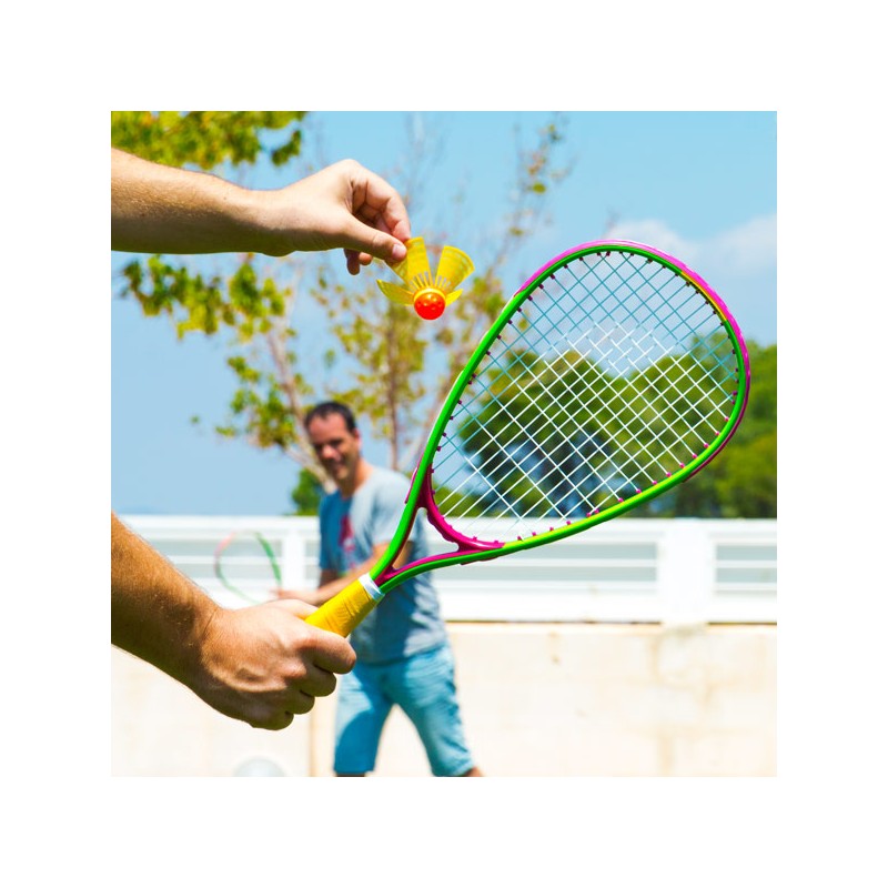 Se vuoi praticare con la tua famiglia uno sport originale e divertente, non lasciarti scappare il set di badminton (6 pezzi). Conosciuto anche come speed badminton o blackminton, questo divertente gioco è un misto tra squash, tennis e badminton. Non c'è bisogno della rete. Adatto a qualunque età. Si può praticare al buio!