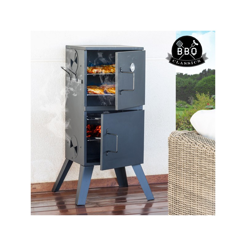 Arriva l'affumicatore verticale a carbone BBQ Classics di cui hai bisogno per le tue feste!www.bbqclassics.comRealizzato in acciaioTermostato (300 ºC)4 piedi2 comodi manici laterali2 sportelli...