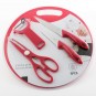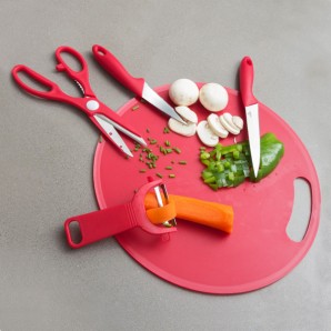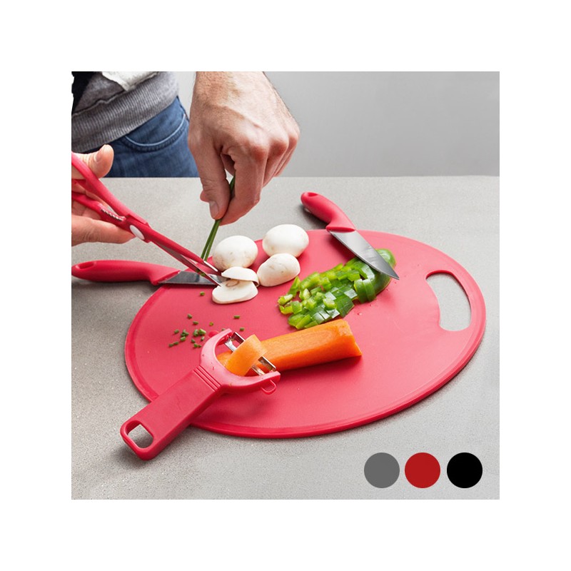 Dai un tocco di eleganza alla tua cucina con il magnifico tagliere con accessori (5 pezzi). In un solo set da cucina avrai tutto il necessario per preparare i tuoi piatti preferiti. Include: 1 tagliere (diametro appross.: 30 cm), forbici, pelino e 2 coltelli (lunghezze con manici inclusi appross.: 18,5 cm y 22,5 cm).