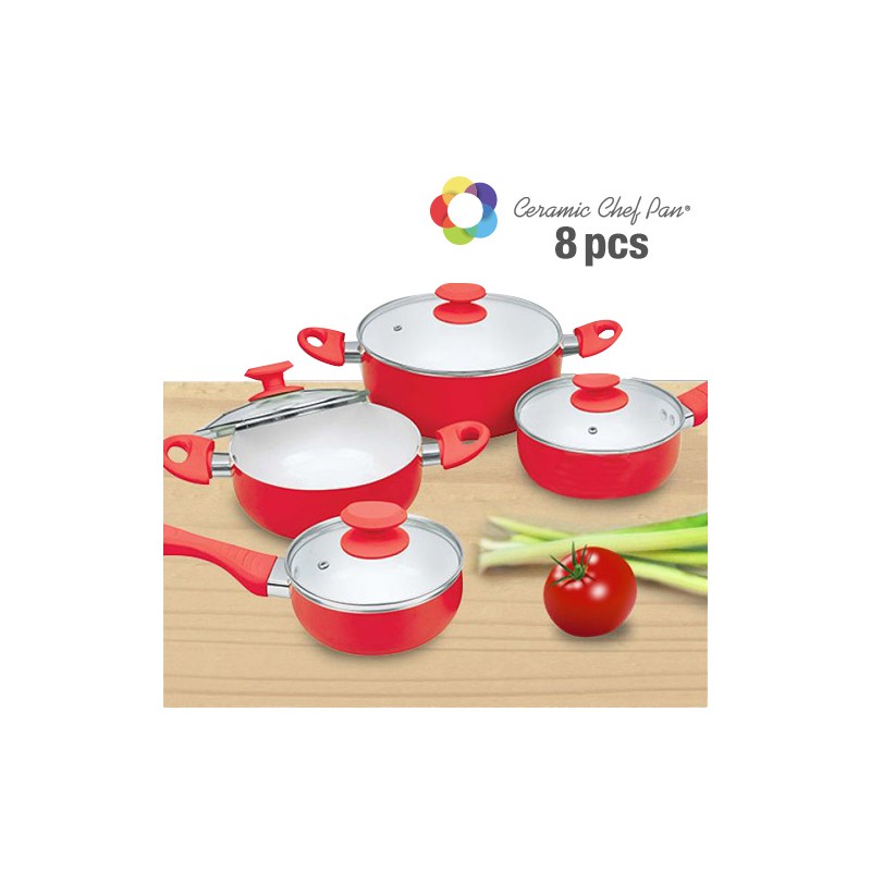 La comoda batteria di pentole Ceramic Chef (8 pezzi)consiste di due pentole, 2 padelle e 4 coperchi in vetro. Con queste eccellenti ed eleganti pentole potrai preparare i pranzi più deliziosi in modo comodo. Le Pentole Ceramic Chef ti forniscono questo pratico set di alta qualità indispensabile per la tua cucina.