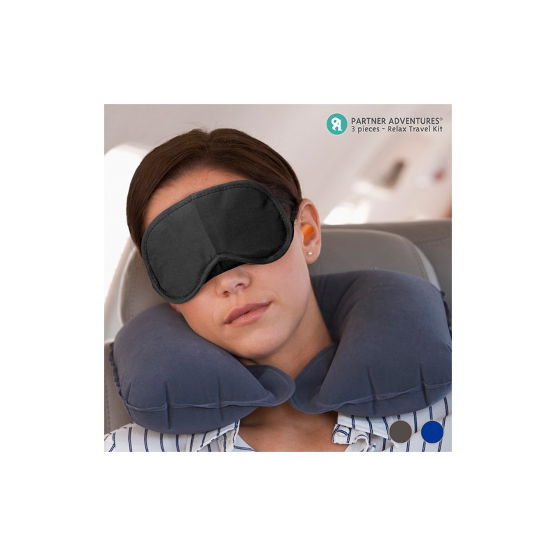 Scopri il kit relax da viaggio Partner Adventures! Questo set da viaggio completo, è perfetto per sentirsi a proprio agio e rilassarsi quando si viaggia ma si può anche utilizzare in altri luoghi o situazioni di stress e affaticamento. Misure del cuscino da viaggio: circa 42 x 26 x 10 cm (a scelta tra il colore grigio o il blu navy).